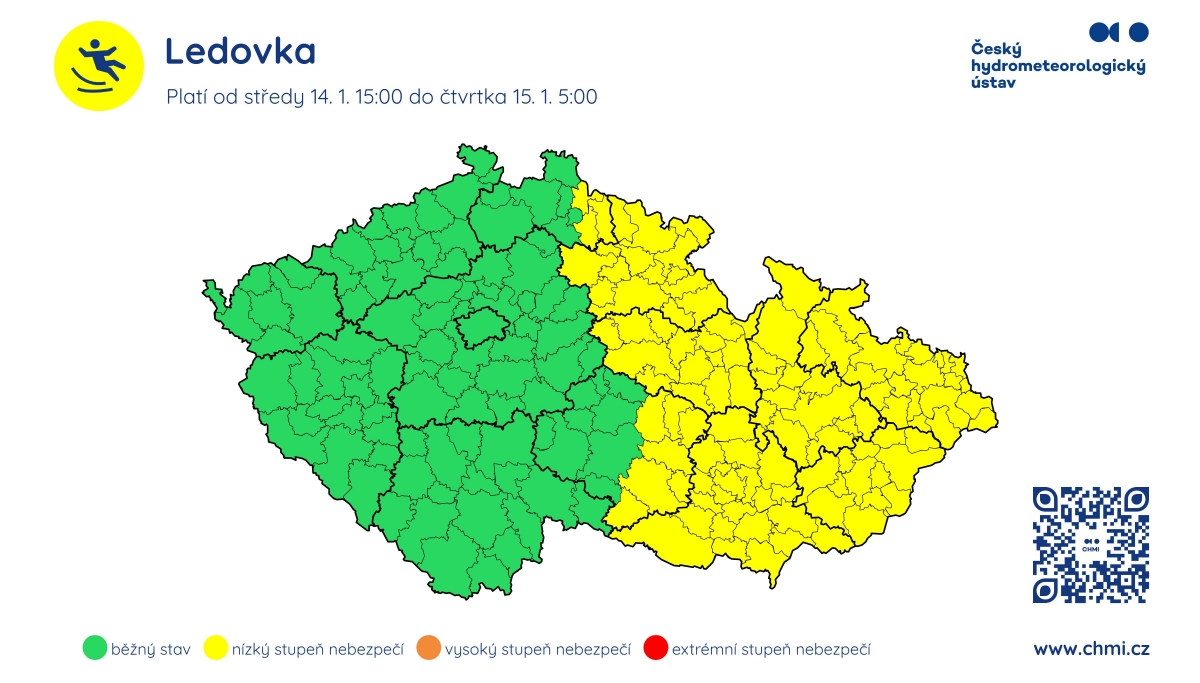 Ve středu (14. 1.) odpoledne, večer a v noci na čtvrtek (15. 1.) bude padat mrznoucí déšť na východě Čech a na Moravě a ve Slezsku. Zde se bude také místy tvořit slabá ledovka do 2 mm.