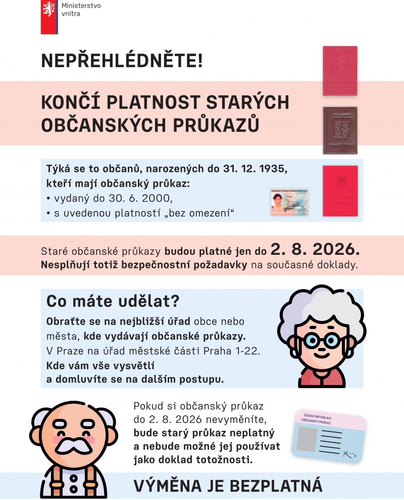 ČR / BOHUMÍN - Ministerstvo vnitra upozorňuje na blížící se konec platnosti některých starších občanských průkazů. Týká se to občanů narozených do 31. 12. 1935, kteří mají občanský průkaz vydaný do 30. 6. 2000 s uvedenou platností „bez omezení“.
